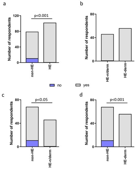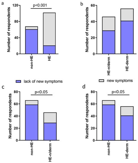 Comparison of occurrence of new symptoms in study groups: (a) non-HE vs. HE; (b) HE-n/derm vs. HE-derm; (c) non-HE vs. HE-n/derm; (d) non-HE vs. HE-derm.