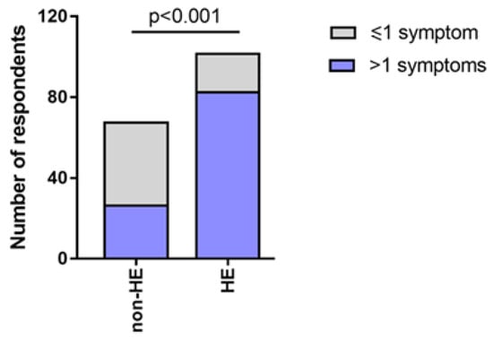 Number of symptoms reported by the HE-study group and the non-HE group immediately after application of the disinfectant.