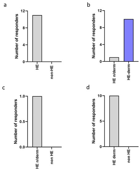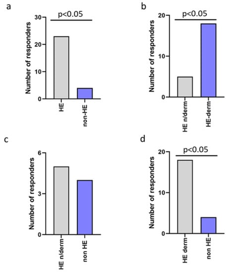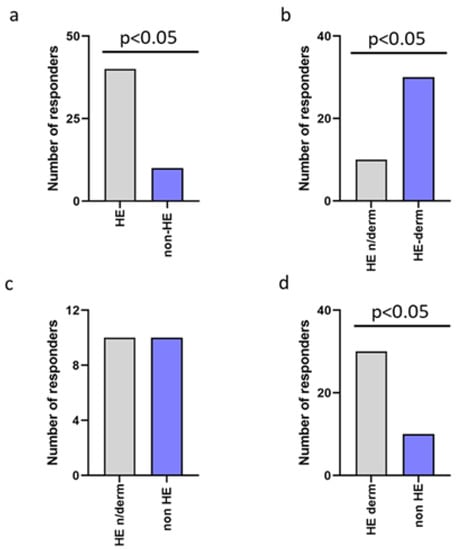 Comparison of the frequency of pruritis reported in the study groups: (a) non-HE vs. HE; (b) HE-n/derm vs. HE-derm; (c) non-HE vs. HE-n/derm; (d) non-HE vs. HE-derm.