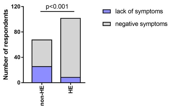 The frequency of new symptoms reported by respondents in both groups (HE-study group vs. non-HE).