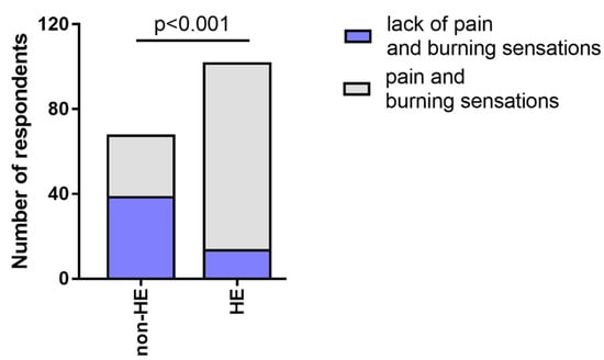 86.27% of the subjects from the HE-study group (n = 88/102) reported pain and burning sensations after using disinfectants, while in the non-HE group, it was reported by 42.65% (n = 29/68) (Figure 9).