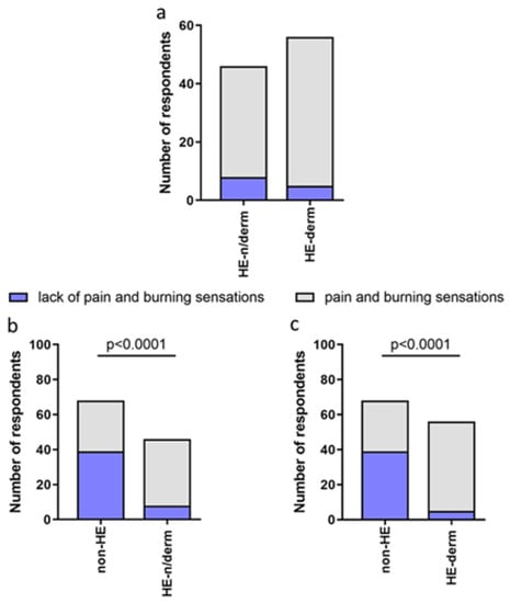 Comparison of the frequency of pain and burning sensations after using disinfectants in study groups: (a) HE-n/derm vs. HE-derm; (b) non-HE vs. HE-n/derm; (c) non-HE vs. HE-derm.