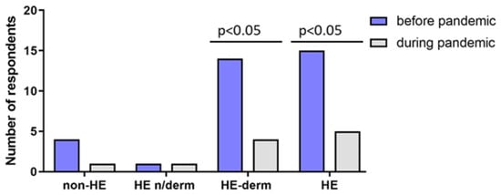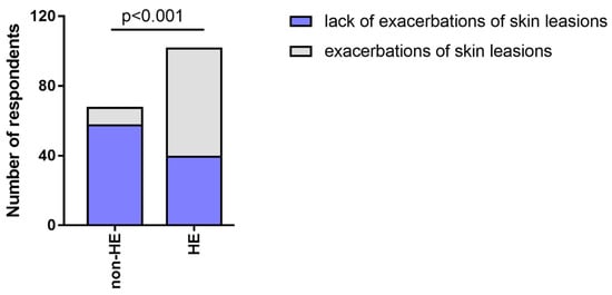 During the pandemic, exacerbations of skin lesions were significantly more frequent in the HE-study group compared to non-HE, HE-derm to HE-n/derm, HE-n/derm to non-HE, and HE-derm to non-HE (p < 0.001, p < 0.05, p < 0.001, p < 0.001, respectively) (Figure 12).