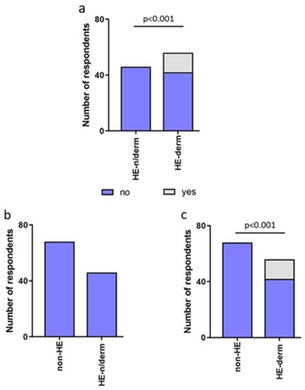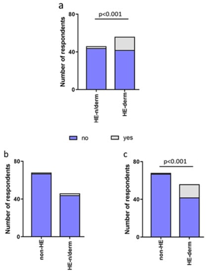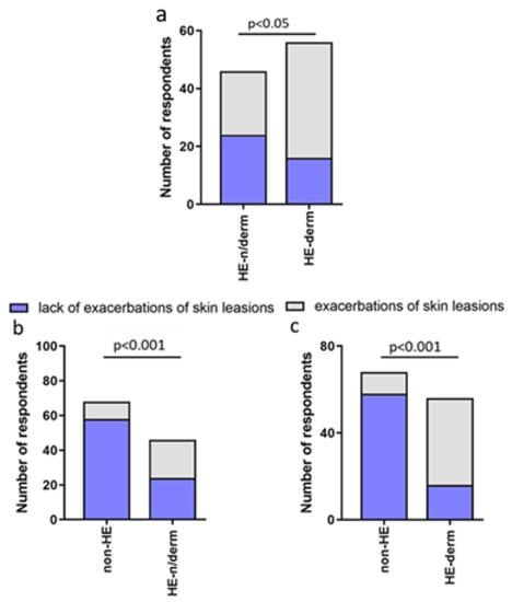 Comparison of the frequency of exacerbations of skin lesions during the pandemic in study groups: (a) HE-n/derm vs. HE-derm; (b) non-HE vs. HE-n/derm; (c) non-HE vs. HE-derm.