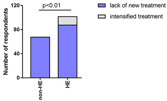 Treatment intensification was used significantly more often in the HE-study group compared to non-HE, HE-derm to HE-n/derm, and HE-derm to non-HE during the COVID-19 pandemic (p < 0.01, p < 0.001, p < 0.001, respectively). No difference between non-HE and HE-n/derm with regard to the changes in treatment was observed (Figure 16).