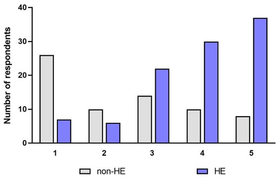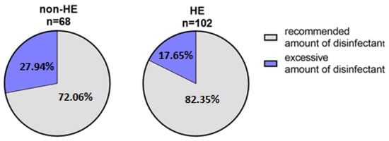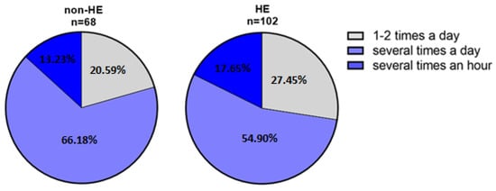 Over of the non-HE group (20.59%, n = 14/68) disinfected their hands about 1–2 times a day, 66.18% (n = 45/68) several times a day, and 13.23% (n = 9/68) several times an hour. Comparing the HE-study group, 27.45% (n = 28/102) disinfected the skin about 1–2 times a day, 54.90% (n = 56/102) several times a day, and 17.65% (n = 18/102) disinfected several times an hour (Figure 17).
