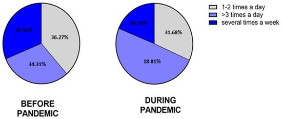 Additionally, the frequency of moisturizing the skin of the hands in respondents from the other study groups (before and during the pandemic) is presented in Figures S7–S9 of the Supplementary Materials.