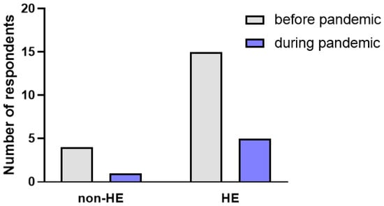 Additionally, 16 participants (15.69%) from the HE-study group had to seek medical advice more often during the pandemic, and there was one such person from the non-HE group (1.47%). (Figure 13).