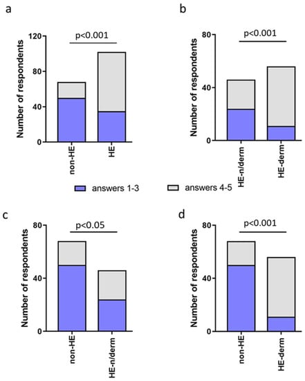 The number of respondents in study groups who chose the answers 1–3 and 4–5 in the assessment of quality of life: (a) non-HE vs. HE; (b) HE n/derm vs. HE-derm; (c) non-HE vs. HE n/derm; (d) non-HE vs. HE-derm.
