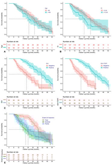 Kaplan–Meier survival curves for age (A), edema index (B), IDH mutation (C), IDH and TERT promoter co-mutation (D), and extent of resection (E), which were significantly associated with PFS in the multivariable analysis.