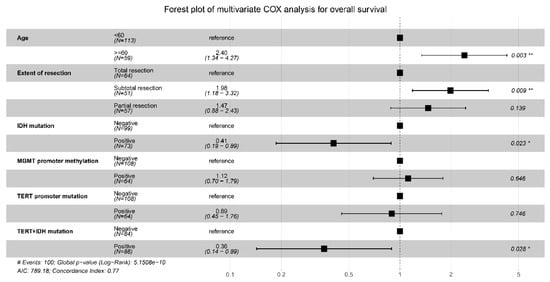 Forest plot for the multivariable COX analysis of OS. Age, extent of resection, IDH mutation, and IDH and TERT promoter co-mutation were identified as the significant prognostic factors for OS. * p < 0.05,** p < 0.01.