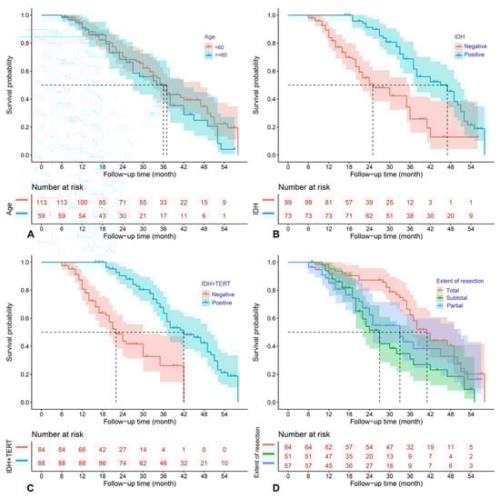 Kaplan–Meier survival curves for age (A), IDH mutation (B), IDH and TERT promoter co-mutation (C), and extent of resection (D), which were significantly associated with OS in the multivariable analysis.