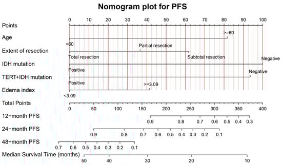 The following supporting information can be downloaded at: https://www.mdpi.com/article/10.3390/jcm12010196/s1. Figure S1: The optimal cut-off points for edema index (A), maximum diameter (B), and tumor volume (C) by running log-rank test for PFS. Figure S2. The optimal cut-off points for edema index (A), maximum diameter (B), and tumor volume (C) by running log-rank test for OS. Figure S3. The calibration curves of PFS for training samples (A-C) and validation samples (D-F) at 12, 24 and 48 months. Figure S4. Time-dependent AUC curves of PFS for training (A) and validation (B) samples. Figure S5. The calibration curves of OS for training samples (A-C) and validation samples (D-F) at 12, 24 and 48 months. Figure S6. Time-dependent AUC curves of OS for training (A) and validation (B) samples.