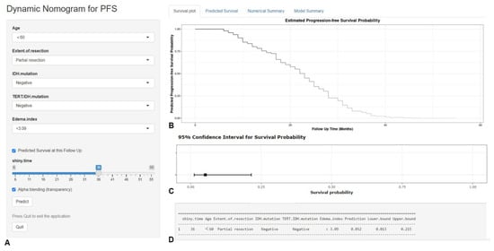 The screenshot of the online dynamic nomogram for PFS. After designating the items (A), neurosurgeons could easily plot the survival curve for an individual patient (B), predict the survival rate at each time point (C), and view the model summary (D).