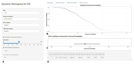 The screenshot of the online dynamic nomogram for OS. After designating the items (A), neurosurgeons could easily plot the survival curve for an individual patient (B), predict the survival rate at each time point (C), and view the model summary (D).