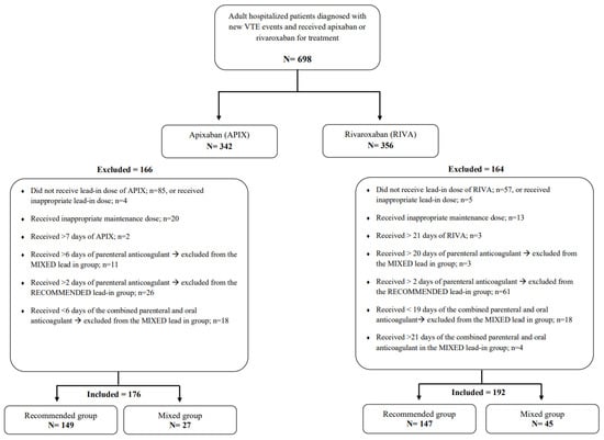 In all, 698 patients with acute VTE events who received treatment using apixaban or rivaroxaban were screened for inclusion. Out of this number, 368 patients were included; the remaining patients were excluded for the reasons illustrated in Figure 1. The recommended-lead-in group had 296 patients, and the mixed-lead-in group had 72 patients. Overall, the mean age for patients was 53.1 ± 19.6 years; in addition, 64.4% were female, and mean BMI was 30.8 ± 7.0 kg/m2. The mean duration for hospital stay was 6.1 ± 13.3 days, with a significantly longer duration of hospitalization for patients in the mixed compared to the recommended-lead-in group (12.2 days vs. 4.6 days; p < 0.001). Comorbidities such as atrial fibrillation, coronary artery disease, hypertension, valvular diseases, diabetes mellitus, thrombophilia, and active cancer were non-significantly more prevalent in the mixed-lead-in group. The history of MB was more prevalent in the mixed-lead-in group (11.1% vs. 4.7% for the recommended); meanwhile, the history of CRNMB was more prevalent in the recommended-lead-in group (3.4% vs. 1.4% for the mixed). Notably, these differences were not statistically significant, as can be seen in Table 1.