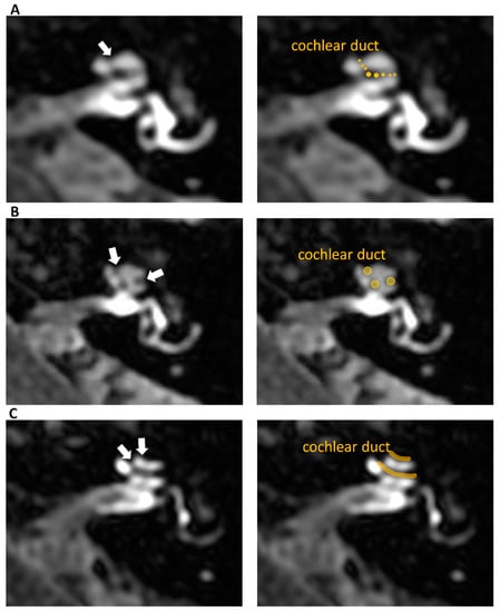 Delayed post-contrast 3D-FLAIR axial images of the left ears at the level of the cochlear modiolus. Right side images on panels (A–C) show the same images as the left ones in respective panels but in the form of companion scans with some line art applied to define specific anatomical structures for easier identification of observed pathologies. Panel (A) presents normal cochlea—grade 0 according to Barath classification, where a non-enhancing cochlear duct is barely visible between the enhancing scala vestibuli and scala tympani (arrow), and no signs of cochlear endolymphatic hydrops are detectable. Panel (B) shows grade 1 cochlear endolymphatic hydrops with partial obstruction of the scala vestibuli by a mildly dilated cochlear duct. The scan shows the nodular non-enhancing regions visible at the margins of the cochlea (arrows). Panel (C) presents grade 2 cochlear endolymphatic hydrops where the cochlear duct is significantly enlarged and obstructs scala vestibuli. The scan shows the non-enhancing stripes within the enhancing scala tympani (arrows).