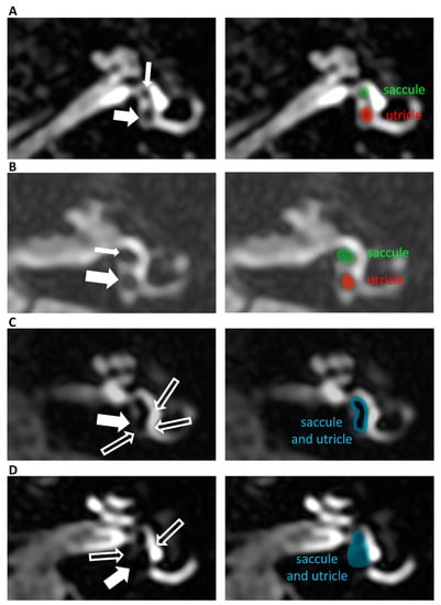 - Bernaerts, A.; Vanspauwen, R.; Blaivie, C.; van Dinther, J.; Zarowski, A.; Wuyts, F.L.; Vanden Bossche, S.; Offeciers, E.; Casselman, J.W.; De Foer, B. The value of four stage vestibular hydrops grading and asymmetric perilymphatic enhancement in the diagnosis of Meniere’s disease on MRI. Neuroradiology 2019, 61, 421–429. [Google Scholar] [CrossRef]