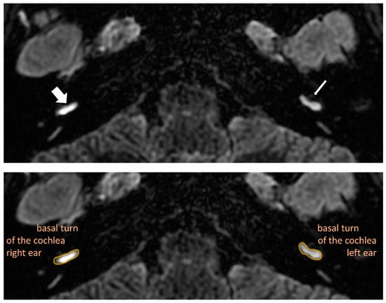 Perilymphatic enhancement describes the enhancement of the inner ear structures. In MD, it has been observed that perilymphatic enhancement is more robust on the affected side than on the healthy side [,,] (Figure 3). The scale, in this case, consists of 2 stages, from 0 to 1, with 1 indicating a more robust enhancement, while 0 describes a regular enhancement.