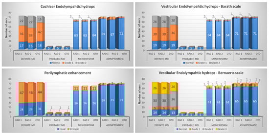 Stacked bar chart presenting differences of cochlear endolymphatic hydrops grading, vestibular endolymphatic hydrops grading on Barath scale, vestibular endolymphatic hydrops grading on Bernaerts modification, and perilymphatic enhancement assessment in each group of analyzed ears (definite Ménière’s, probable Ménière’s, ears with Menieriform symptoms, asymptomatic ears) performed by three observers (two radiologists and one otorhinolaryngologist in training; Rad1, Rad2, and Oto, respectively).