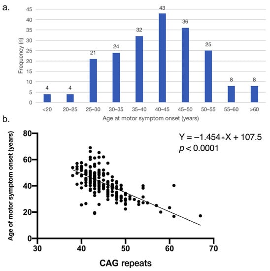 (a) Frequency distribution of age at motor symptom onset in Chinese HD patients (n = 205). The group of 40–45 years accounted for the highest proportion. (b) Correlation between CAG repeats and age of onset (p < 0.0001). The simple linear regression equation is Y = −1.454 ∗ X + 107.5.