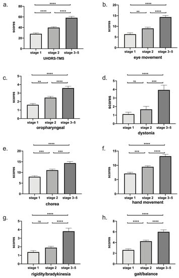 (a) Total motor score grouped by disease stage was shown. There was a significant increase in total motor score across each stage (p < 0.0001). (b–h) According to Fingin’s classification, scores of seven subdomains were shown. Eye movement, oropharyngeal, hand movement, chorea, and gait/balance deteriorated with stage, while rigidity/bradykinesia and dystonia only worsened in the late stage. ****: p < 0.0001; ***: p < 0.001; **: p < 0.01; ns: p > 0.05.