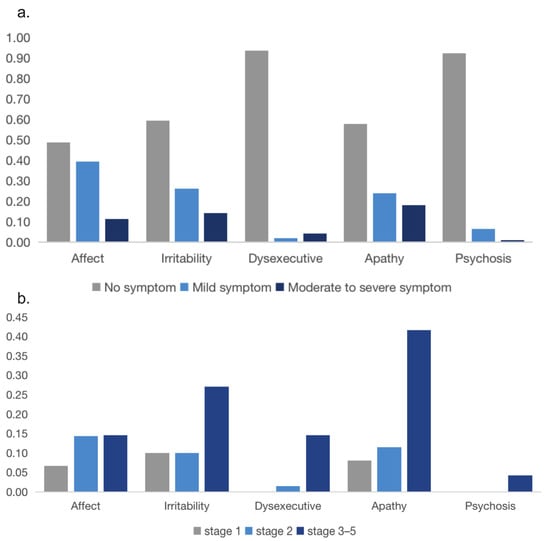 (a) Prevalence of neuropsychiatric symptoms in HD patients at first diagnosis. (b) Prevalence of moderate to severe symptoms on the behavioral subscales across different disease stages.