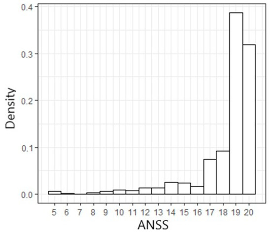 The cohort was divided into three pre-specified ANSS groups as routinely used in practice [22]: low (≤14), intermediate (15–17), and high (18–20) (Table S1). Due to the low number of patients with very low ANSS (<10), this group was included in the low (≤14) group. Most of the study population comprised the high-score group (79.8%), creating a leftward skew in the ANSS distribution, with a median of 19 (IQR 18–20) (Figure 1). A total of 59 patients (8.5%) had a low ANSS and 81 patients (11.7%) had an intermediate ANSS.