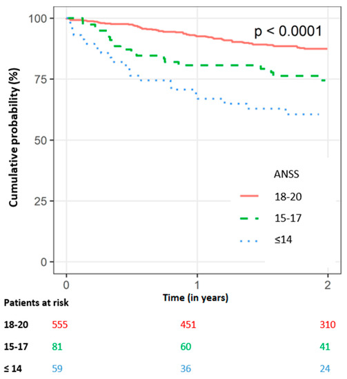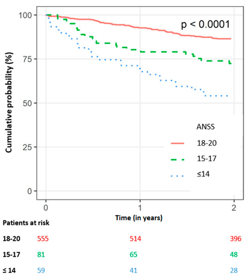 In this study, the cohort was divided into three prespecified ANSS groups (high risk, ANSS ≤ 14; medium risk, ANSS 15–17; and low risk, ANSS ≥ 18). We found that patients with ANSS ≤ 14 were significantly more likely to die of any cause for one year following ICD implantation and over four-fold more likely to die without having received appropriate device therapy compared with patients with ANSS ≥ 18. Our results remained significant at two years of follow-up and were validated by logistic regression models, proving the strength of the ANSS as a prognostic tool for ICD-implanted patients.