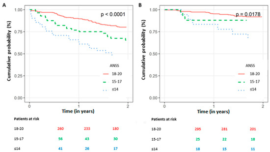 Kaplan–Meier survival curve for all-cause mortality over time in high vs. low clinical risk patients by admission Norton scale score. (A) High-clinical-risk patients: ≥70 years old and/or baseline serum creatinine values ≥ 1.5 mg/dL. p value < 0.0001. (B) Low-clinical-risk patients: <70 years old and baseline serum creatinine values < 1.5 mg/dL. p value = 0.0178. Numbers reflect patients at risk. ANSS, admission Norton scale score.