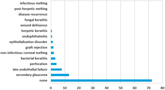 Assessment of the correlation between many variables and the occurrence of graft complications using the multivariate analysis led to the identification of three important variables: a high-risk group, concomitant ophthalmic diseases, and connective tissue diseases. As the high-risk group represents patients with specific indications, it can be assumed that the indication for corneal transplantation is a significant risk factor, as reported in several previous studies [15,21,22,33,34,35,36].