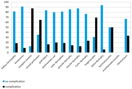 This retrospective, observational study included a chart review of the hospital records of patients who underwent PK between January 2016 and December 2020 at the Department of Ophthalmology of the District Railway Hospital in Katowice, Poland. The study adhered to the tenets of the Declaration of Helsinki. The data collected for the study included patients’ age and sex, date of surgery, reason for surgery, corneal transplant technique, preoperative visual acuity, concomitant conditions, eye surface disorders, number of previous corneal transplantations, lens status, presence of glaucoma before and after keratoplasty, postoperative visual acuity, occurrence of any complications following the surgery, and any surgical interventions after keratoplasty. The complications found in the analyzed group were classified as follows: epithelialization disorders, wound dehiscence, infectious keratitis, recurrence of herpetic keratitis, graft rejection, secondary glaucoma, late graft failure, and infectious and noninfectious corneal melting. The incidence of these complications in the “low-risk” and “high-risk” graft failure groups was compared. Patients with conditions such as ocular burn and limbal stem cell deficiency, perforation, keratitis, at least one graft decompensation, or a history of herpetic keratitis were considered to be at high risk. In addition, the number of unique complications, depending on the indications and other risk factors such as connective tissue diseases, accompanying eye diseases, and previous corneal transplants, and the odds ratio (OR) of complication occurrence in low- and high-risk transplants were examined. Data are presented as the number of cases with a percentage value. The relationships between the qualitative variables were compared using the Pearson chi2 test. The influence of the studied factors on the occurrence of complications was assessed by generating a single and multifactor logistic regression model with selected risk factors included. Data for the model are presented as ORs with 95% confidence intervals (CIs). p values < 0.05 were considered significant. Statistical analysis was performed using the RStudio software in the R language.