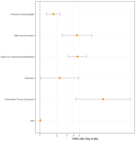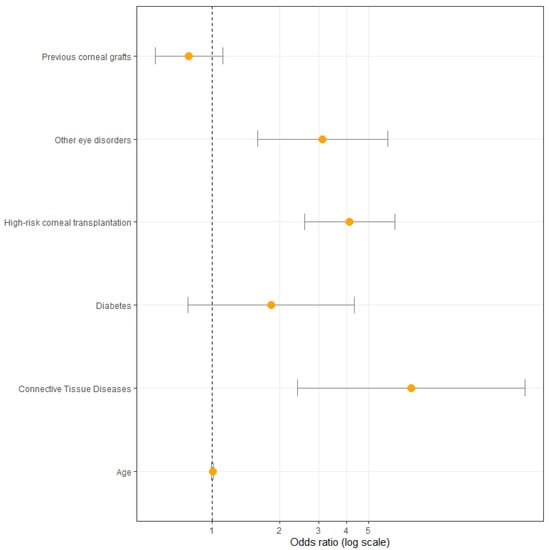 Several factors were included in the univariable analysis (Figure 3). The following were the factors associated with graft failure: age (OR: 1.01, CI: 1.00–1.02, p = 0.03), high-risk group (OR: 4.65, CI: 3.22–6.72, p = 0.00), previous corneal transplants (OR: 1.73, CI: 1.32–2.26, p = 0.00), concomitant ophthalmic diseases (OR: 4.56, CI: 2.49–8.33, p = 0.00), connective tissue diseases (OR: 13.29, CI: 4.40–40.08, p = 0.00), and diabetes (OR: 2.23, CI: 1.03–4.82, p = 0.04).