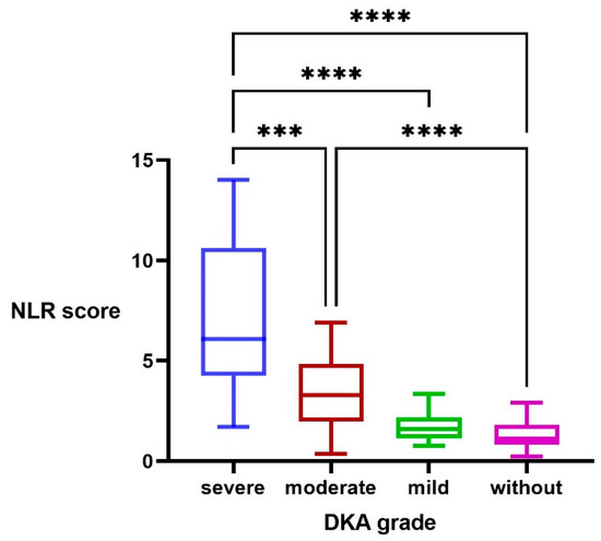 A Kruskal–Wallis H test was performed to determine if there were significant differences in NLR scores between children without ketoacidosis and those with mild, moderate, or severe ketoacidosis. The distributions of NLR scores were not similar for all groups, as assessed by visual inspection of a boxplot. Median NLR scores increased from those without ketoacidosis (1.11) to mild (1.58), moderate (3.71), and severe (5.77) ketoacidosis groups (Figure 1). The distributions of NLR scores were significantly different between groups: X2(3) = 97.681, p = 0.000. Subsequently, multiple comparisons were performed through post hoc analysis using Dunn’s (1964) procedure with a Bonferroni correction. Adjusted p-values are presented. This post hoc analysis revealed statistically significant differences in median NLR scores between those with severe DKA and those with moderate (p = 0.002), mild (p = 0.000), or no DKA (p = 0.000); between mild and moderate DKA (p = 0.012), but not between those with mild DKA and no DKA (p = 1.000).