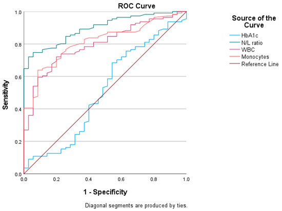 ROC curve analysis of HbA1c, WBCs, monocytes, and NLR; ROC, receiver operating characteristic. Significant differences were found (p < 0.000, respectively, for NLR, WBCs, and monocytes).