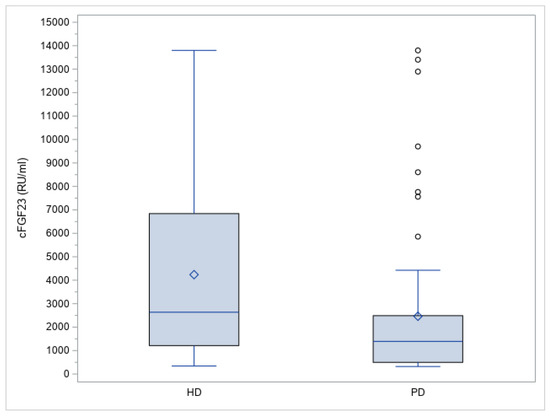 The cFGF23 levels were significantly higher in HD compared to PD patients (p = 0.0017) (as represented in Figure 1). Also, the levels of phosphorus (p = 0.0041) and 25-(OH) D3 (p < 0.0001) were significantly different.
