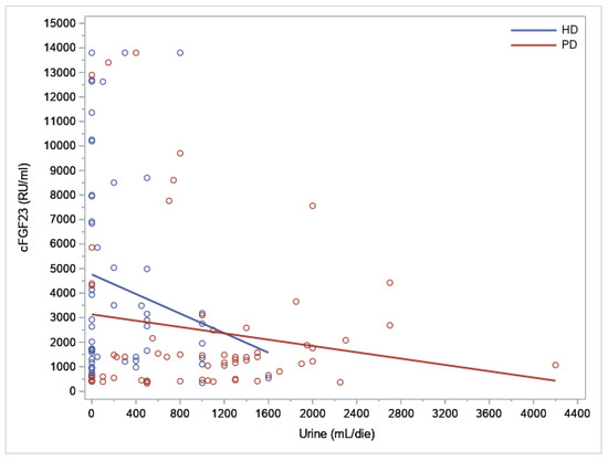 In conclusion, cFGF23 was significantly higher in HD patients than in PD patients, and it was higher in patients without residual UO. We found a significant negative correlation between cFGF23 and the residual UO volume, but the correlation was not significant when considering the type of dialysis, as to say that in the relationship between the residual UO and FGF23, the type of dialysis represents a confounding factor. Our study found that the dialysis modality is an independent predictor of FGF23 levels. In particular, PD is associated with lower FGF23 levels than HD.