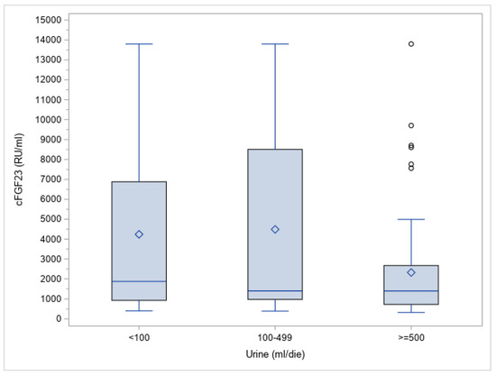 The residual urine output (UO) was preserved in 93 (69.9%) patients. The median cFGF23 level was higher in patients without UO (median, 1874.4 RU/mL; min-max 399.4–13,800.0) than in those with a preserved UO (median, 1400.1 RU/mL; min-max, 320.5–13,800) without reaching the statistical significance (p = 0.12).