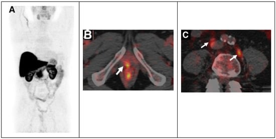 64CuCl2 PET/CT in prostate cancer relapse. (A) 64CuCl2 biodistribution with high activity in the liver, and kidneys and lesser in the bowel. 64CuCl2 PET/CT image of pelvis from a old man treated with radical prostatectomy with rising PSA level demonstrated copper-avid recurrence in vescicourethral anastomosis (B) and nodes (C). Adapted from ref. [] with (This research was originally published in JNM. A. Piccardo et al. 64CuCl2 PET/CT in prostate cancer relapse. J. Nucl. Med. 2018, 59, 444–451. ©SNMMI).