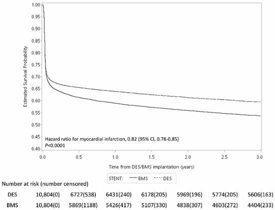 A stroke is a known complication after myocardial infarction (MI). Parts of the causes of ischemic stroke and MI are similar usually because the blood coagulates into a “thrombus” and blocks the blood vessels in different parts of the body, forming an unhealthy state. With respect to the causes of the blood clotting into a thrombus, in addition to common causes such as hyperlipidemia, diabetes, high blood pressure, obesity, stress [15], or the patient’s blood being prone to clotting [16], etc., a thrombus being generated during vascular reconstruction may be the main reason [15,16,17]. We could reasonably infer that DESs had more coatings of the drug polymer that inhibits the proliferation of the intrinsic cells than BMSs did, which could effectively reduce the probability of postoperative vascular restenosis and thrombus formation, thereby reducing the subsequent risk of ischemic stroke caused by a thrombosis blocking the cerebral blood vessels. Despite this, a previous study [11] used a smaller number of cases (n = 3051) and indicated that the risk of ischemic stroke was not significantly different between DES and BMS patients (aHR = 1.02; 95% CI: 0.67–1.53; p-value = 0.937). However, the current study used a larger sample size (n = 21,628) and found that the patients who received DESs had a significantly lower risk of ischemic stroke (aHR = 0.89; 95% CI: 0.82–0.96; p-value = 0.0027) than those who used BMSs did.