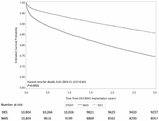 The results of this study showed that the mortality in the DES group was around 14% and that that in the BMS group was around 25% at 3 years. Previous studies on 3-year mortality after PCI have had widely varying results (3.6%–25%) [25,26,27,28,29,30,31]. The difference in the mortality rate could reflect a health care different from most countries in the world. Usually, real-world patients may be less healthy on average than clinical trial admissions. In addition, there is heterogeneity in the populations selected in studies, such as the sex ratio of patients, average age, severity of heart disease, overall health status, PCI treatment process and method, follow-up care mode, etc., all of which affect the mortality rate.