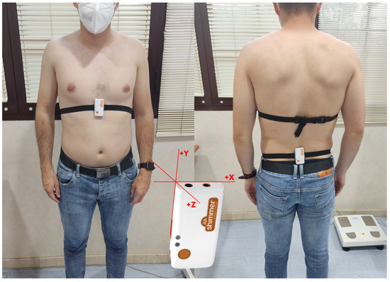 Kinematic parameters were collected with two Shimmer3 (Shimmer Research Ltd., Dublin, Ireland) inertial measurement units (IMUs). Kinematic parameters such as the trunk’s angular velocity (°/s) and linear acceleration (m/s2) were assessed using the gyroscope and the accelerometer included in the Shimmer3 IMUs. The Shimmer3 IMU can measure kinematically along three orthogonal axes (X, Y, Z). A sensor was placed snugly secured to the lower back, specifically at the L3–L4 level, and fixed with adhesive tape to reduce error due to the movement of the sensor on the skin. The other sensor was placed in the same way but in the medial third of the sternum in the dorsal area (Figure 1). The three orthogonal axes embedded in the body represented three directional movements: X, lateral movement; Y, vertical movement; and Z, anterior-posterior movement. The Shimmer3 data-sampling rate was set to 256 Hz.