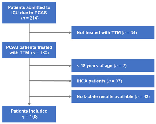 A total of 214 PCAS patients were admitted to an ICU during the study period, of whom 35 did not receive TTM were excluded. Another 72 patients aged < 18 years, suffered from IHCA, and with missing data needed to calculate the rCAST score were excluded. The remaining 108 OHCA patients with PCAS received TTM and were enrolled for analysis (Figure 1).