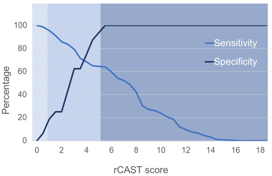 Sensitivity and specificity of using the rCAST score to predict poor neurological outcomes at day 28 in out-of-hospital cardiac arrest patients. There was decreased sensitivity and increased specificity to using a higher rCAST score as a cut point to predict the poor neurologic outcomes.
