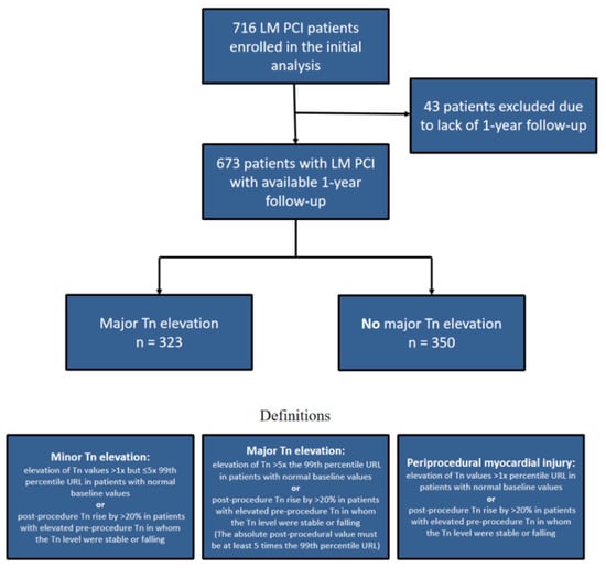 LM patients were categorized into two groups. The first group was composed of 323 patients with major cardiac Troponin I elevation defined as an elevation of Tn values more than 5 times the 99th percentile URL in patients with normal baseline values or post-procedure Tn rise by >20% in patients with elevated pre-procedure Tn in whom the Tn level was stable or falling (however, the absolute post-procedural value still needs to be at least 5 times the 99th percentile URL). Tn elevation cut-off values were determined based on the criteria for PCI-associated MI ≤ 48 h after the PCI procedure (MI type 4a) from the most recent Fourth UDMI [9]. Patients at our facility had Troponin I levels measured prior to and after the PCI intervention as part of the routine clinical management. The second group consisted of patients without major cardiac Troponin I elevation (Figure 1).