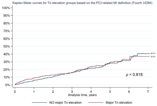 Procedural clinical results are summarized at the end of Table 4. Naturally, PMI type 4a was diagnosed only in patients from group with major Tn elevation (4.9% of all patients). Contrast induced nephropathy was found more frequently in the group with major Tn elevation (5.6% vs. 3.1%; p = 0.121), but the difference was not significant. Frequency of other periprocedural complications were on the similar levels in two groups. There was no significant difference in the seven-year long-term all-cause mortality between groups with and without major Tn elevation (36.9% vs. 40.6%; p = 0.818) (Figure 2).