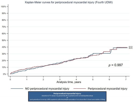 In a subanalysis, we decided to examine the criteria for cardiac procedural myocardial injury. Cardiac procedural myocardial injury is arbitrarily defined by increases in Tn values (>99th percentile URL) in patients with normal baseline values (≤99th percentile URL) or a rise of Tn values > 20% of the baseline value when it is above the 99th percentile URL but it is stable or falling [9]. In terms of troponin elevation, the difference is that the criteria for cardiac procedural myocardial injury elevation do not require a five-fold increase compared to the 99th percentile URL (in comparison to periprocedural MI criteria). In our group, the criteria for cardiac procedural myocardial injury were met in 56.0% of patients. Long-term mortality in that subanalysis showed no significant differences (39.5% vs. 38.8%; p = 0.997) between the groups (Figure 3).