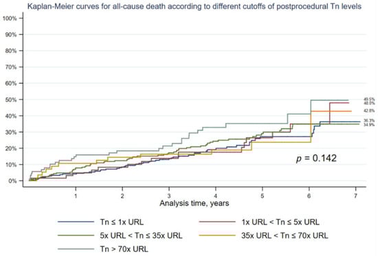 Moreover, the graph presenting Kaplan-Meier curves for all-cause death according to different cutoffs of postprocedural Tn levels is provided. There is no significant difference in long-term mortality although the highest mortality in patients with >70× Tn elevation is visible (49.5%; p = 0.142) (Figure 4).