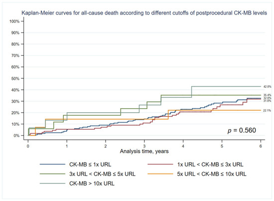 Forty-eight percent (323 patients) of patients from our group had CK-MB mass levels measured before and after the LM PCI procedure. Additionally, we decided to investigate the association of CK-MB mass with long-term all-cause mortality in a subanalysis. The Kaplan-Meier curves for all-cause mortality according to different cutoffs of postprocedural CK-MB levels are provided. There is no significant difference in long-term mortality (p = 0.560) (Figure 5).