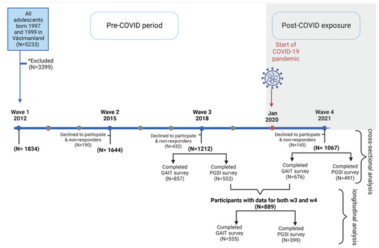 Adolescents born in 1997 and 1999 and living in the county of Västmanland in Sweden were asked to participate in the prospective cohort study “the Survey of Adolescent Life in Västmanland Cohort” (SALVe cohort) that started in 2012 by completing a self-report questionnaire. So far, data at four time points have been collected in the SALVe cohort represented by wave 1 to wave 4 (w4), as shown in Figure 1. In the present study, data from wave 3 (w3), regarded as the pre-COVID-19 period, and from w4, regarded as the post-COVID exposure, were used. Thus, 1067 young adults who completed w4 on October 2021 were included in the cross-sectional analysis, and of these, 889 participants also completed the w3 questionnaire on November 2018 and were included in the longitudinal analysis. Gaming activity and problematic gaming were measured by the Gaming Addiction Identification Test (GAIT). GAIT was completed by 676 participants in w4 and 857 in w3. To assess gambling activity and problem gambling, the Problem Gambling Severity Index (PGSI) was used and was completed by 491 participants in w4 and 553 in w3. For the longitudinal analysis, 555 completed the GAIT survey and 399 completed the PGSI.